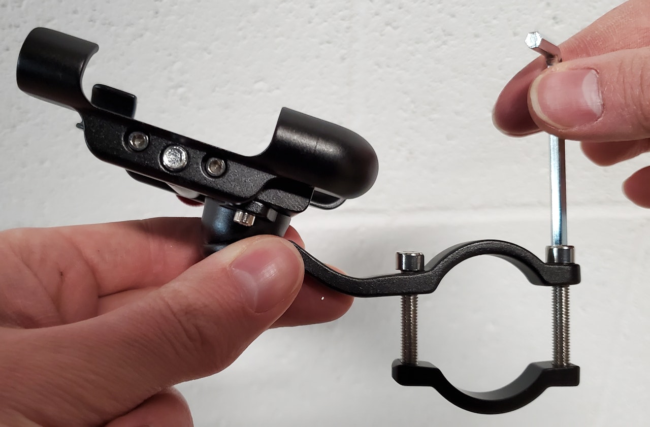 - Loosen and remove both of the bolts holding the clamping end of the Cell Phone Mount together