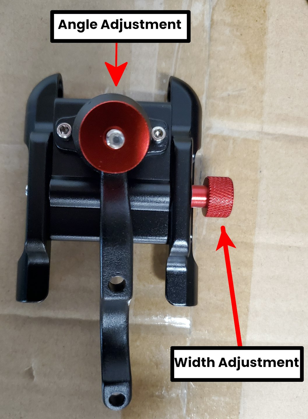 Make any additional changes to the Cell Phone Mount's mounting, angling and width with the knobs pointed to in the image here.