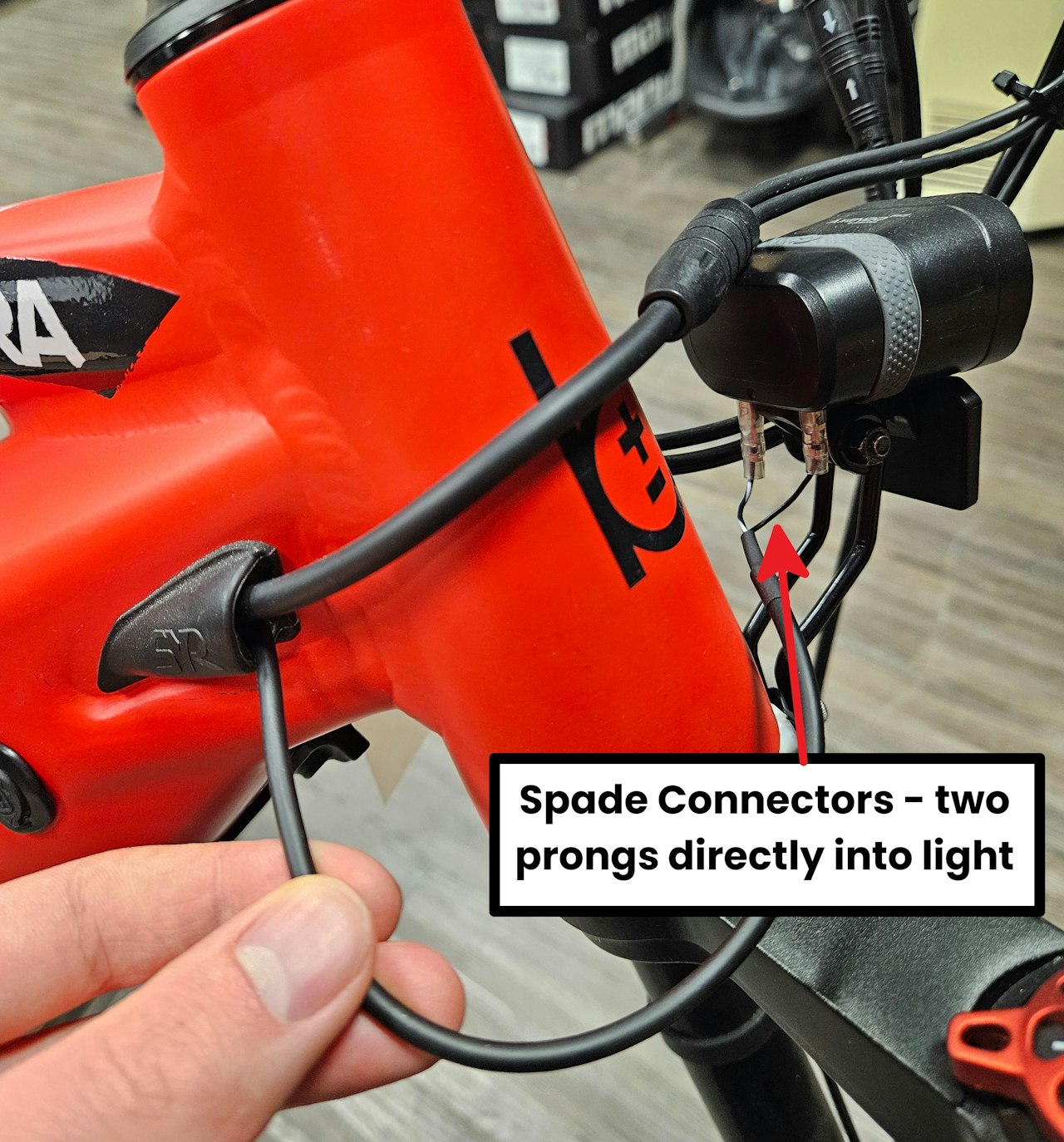 You will now need to connect the headlight wires of the bike to the headlight. Check your bike and consult the attached images to determine the connection style found on your eBike.