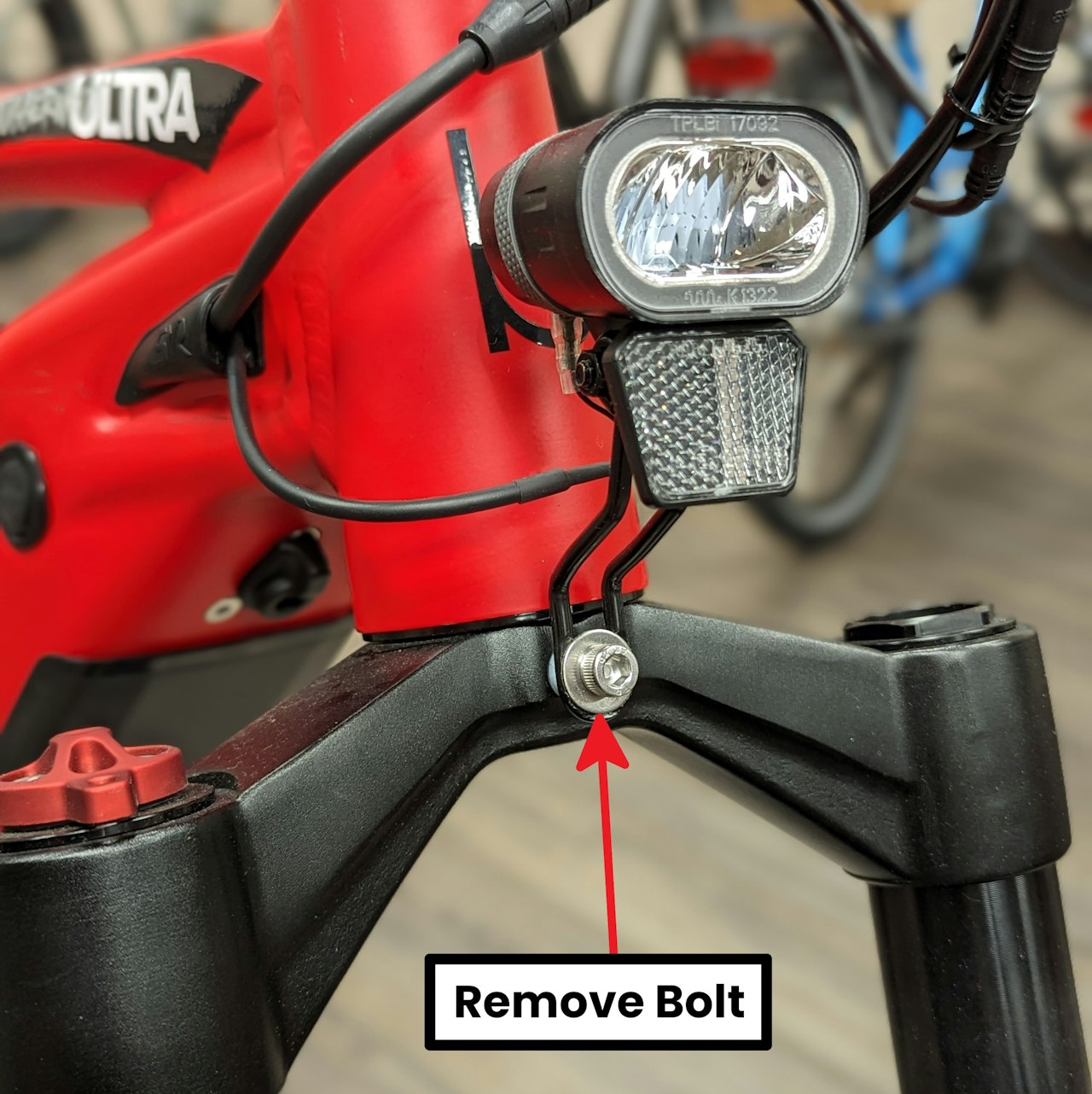 To start you must remove the eBike's stock headlight. Do this by reversing the steps you followed to install the headlight initially assembling your eBike! With the headlight physically removed from the bike but still plugged in move to the next step.