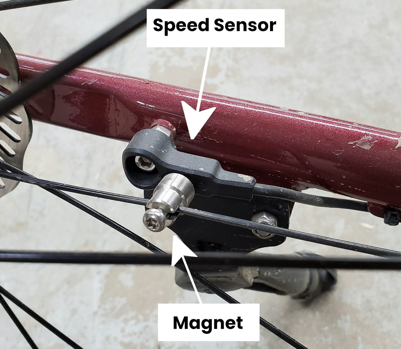The speed sensor consists of a sensor attached to the non-drive side chainstay on the bike along with a magnet positioned on one spoke of the wheel. The rotation of the magnet and wheel is how the bike speed is determined by the controller.