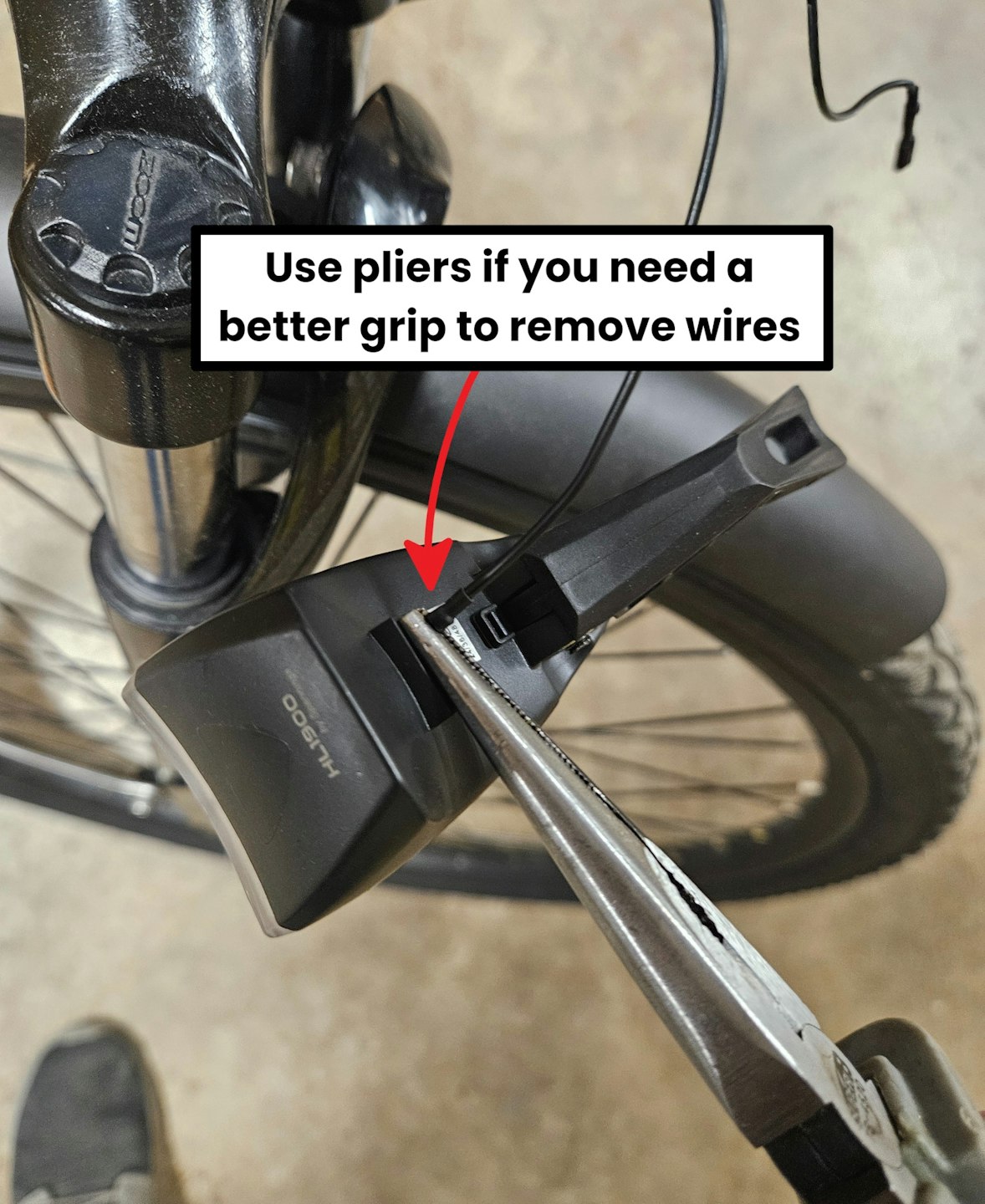 Lastly reconnect the power wires to the headlight. If your headlight power wires are long enough gently pull them out from the frame and reconnect them to your headlight in the same way there were previously connected!
