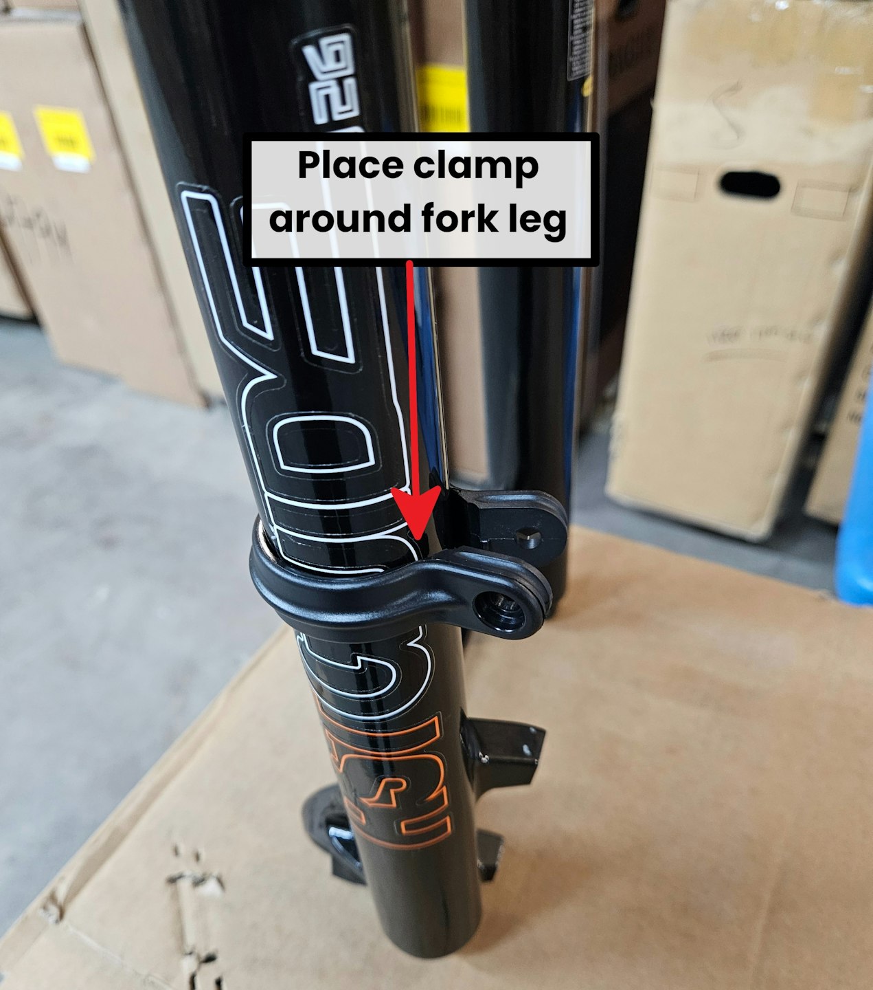 Slide the mounting bracket clamps over the fork leg - ensuring the solid section is pointing towards the front of the fork
