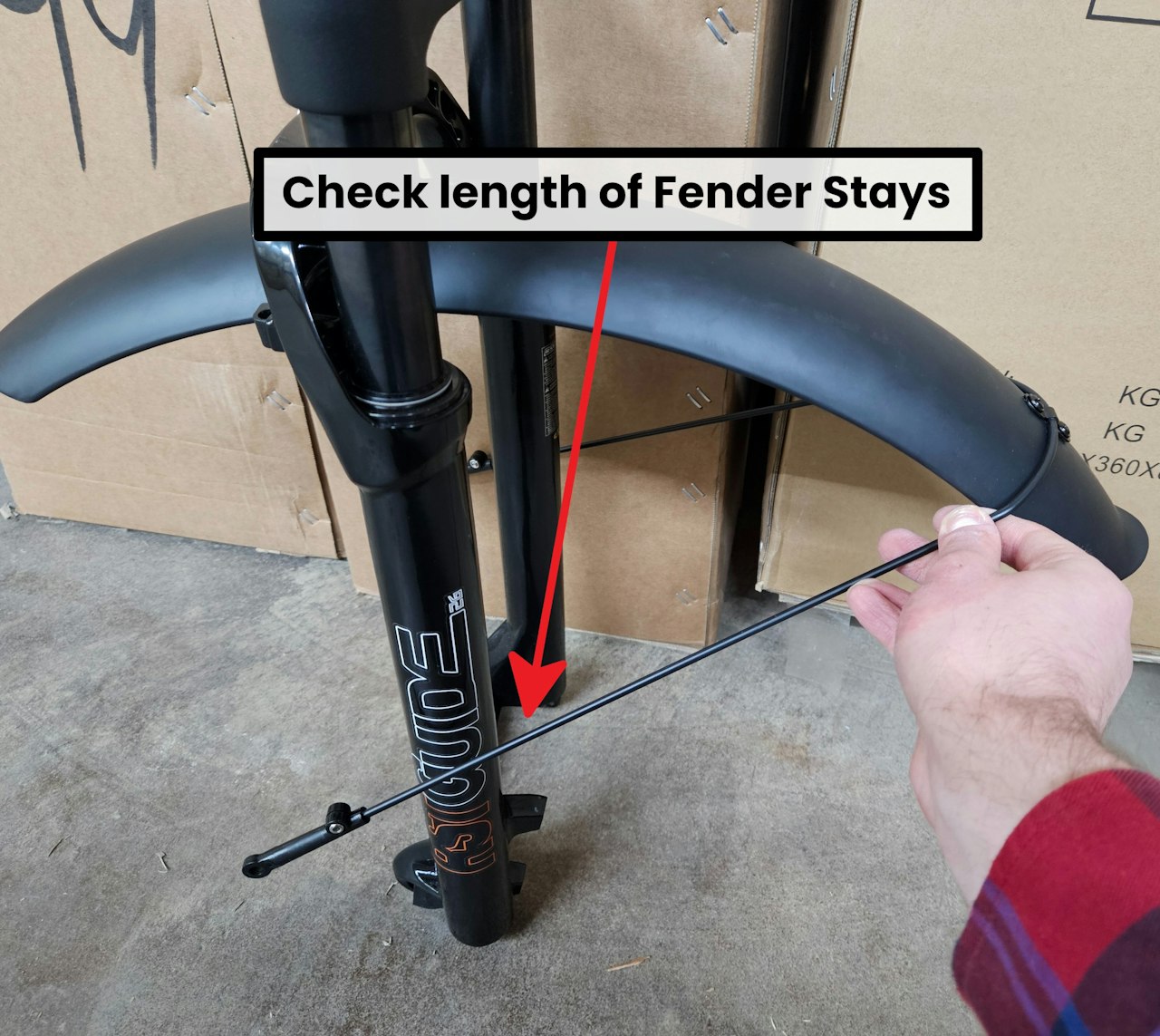 Loosely install your front fender to the fork arch. Take note of how the stays line up with the brackets. If the stays are too long, as shown in the third image, you may need to cut them and make them shorter.
