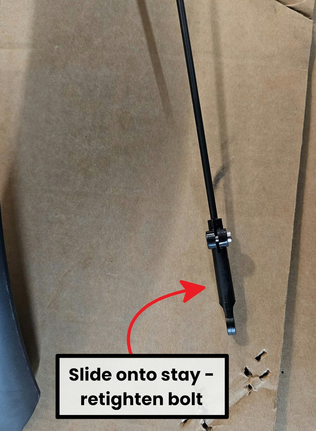 Slide this fender stay arm onto the fender stay. You may need to loosen the bolt a bit more to attach this and slowly wiggle it onto the stay.