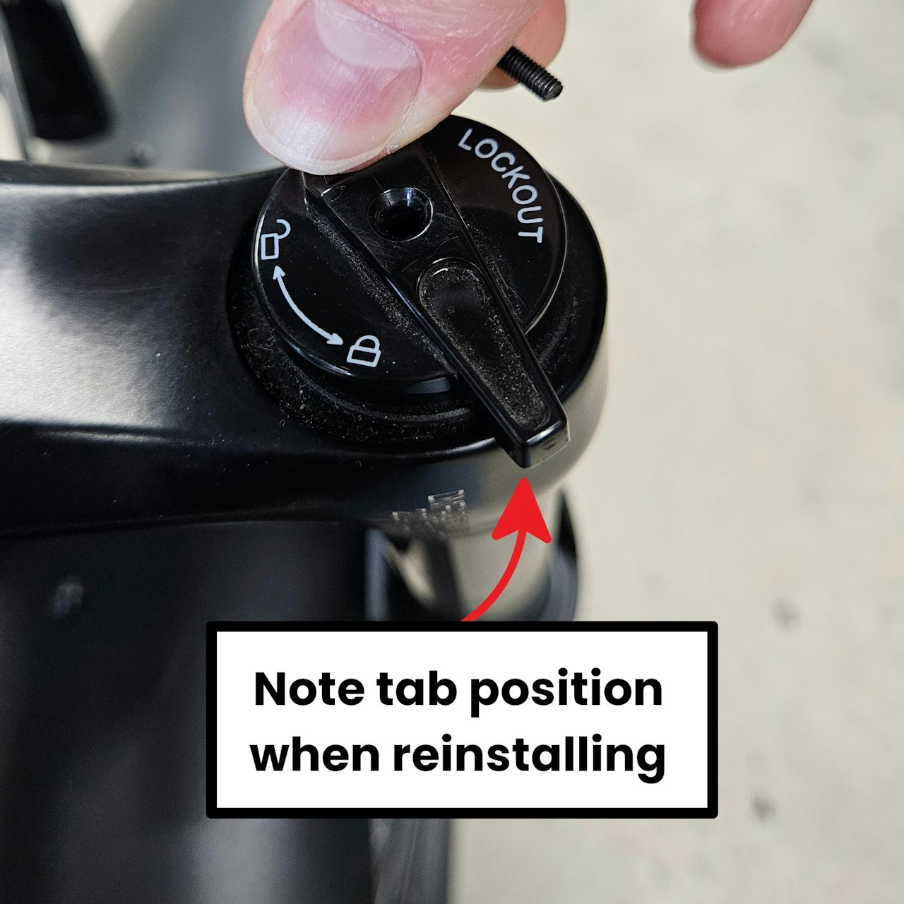 With the lockout kob positioned where you would prefer it, tighten the screw back into the top of it to reinstall the knob onto the fork.