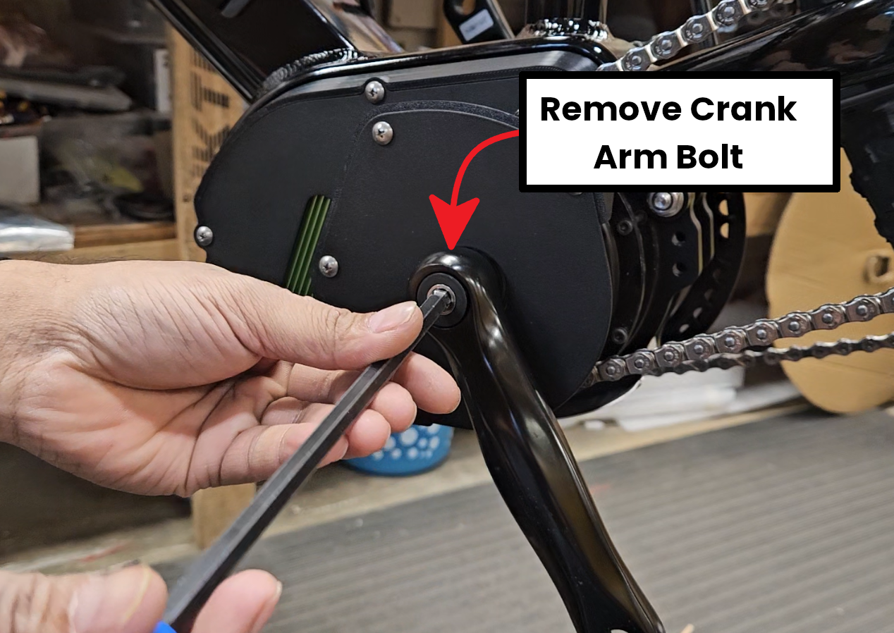 Remove the crank arm bolt on the XD Drive Side of the bike using an 8mm Allen Key