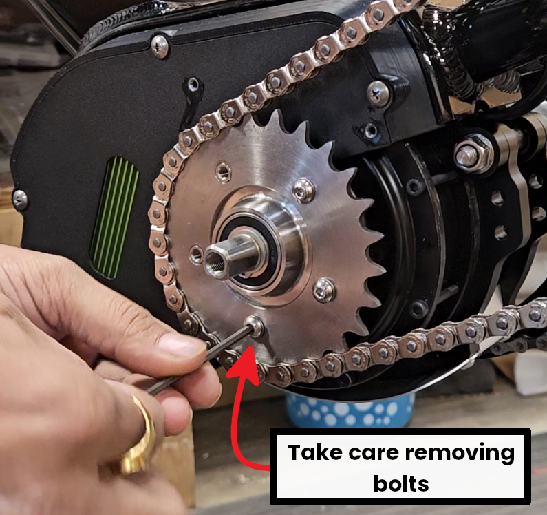 Take your 3mm Allen Key. Remove the 5 bolts securing the Front Drive Sprocket to the motor