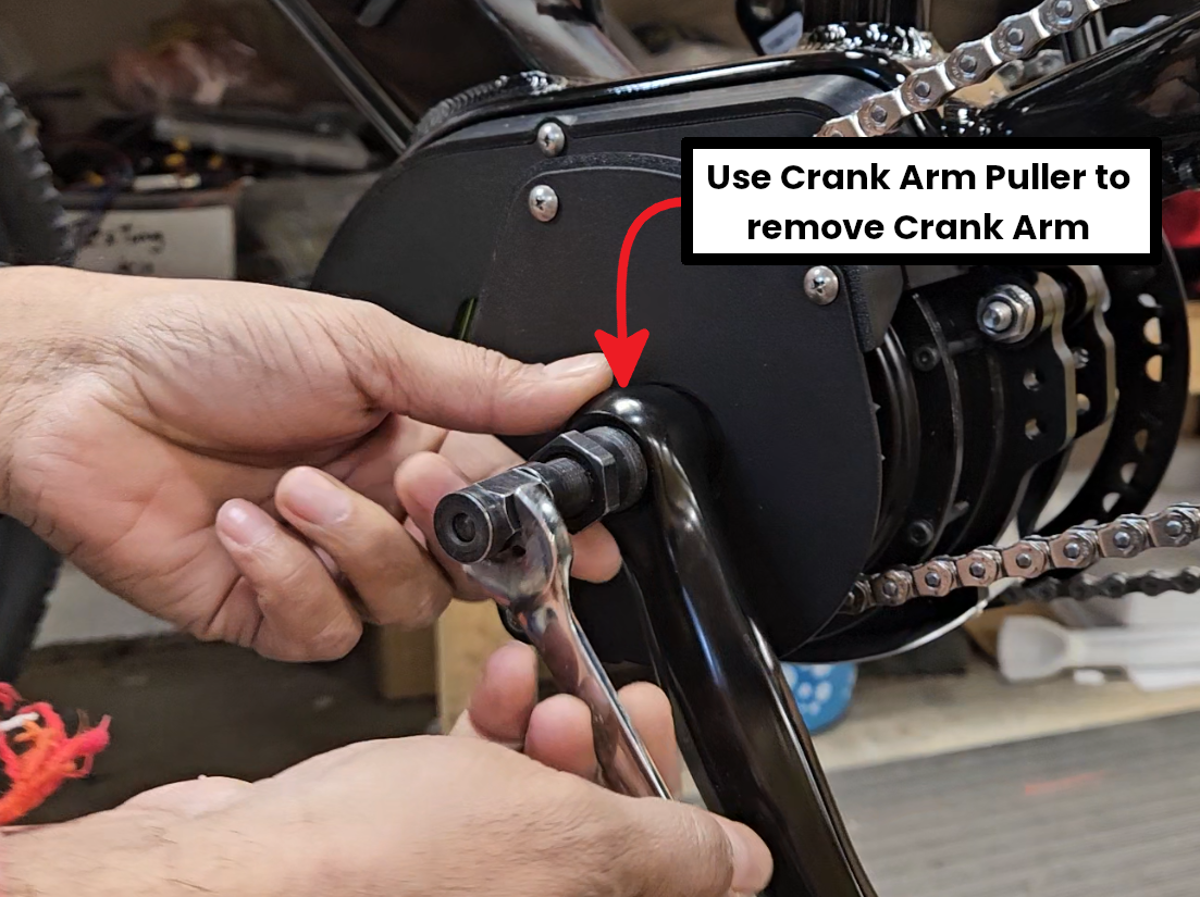 Remove the crank arm on the XD Drive side with your Crank Arm Puller and wrench.