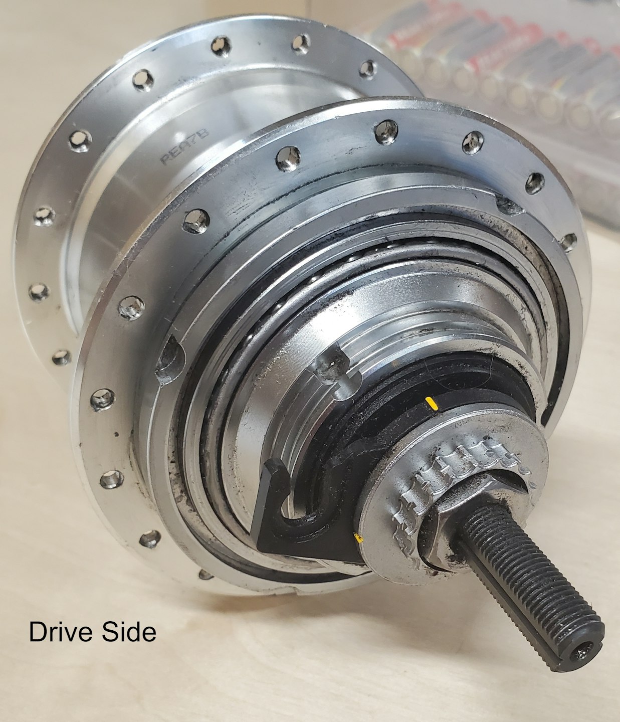This service can be performed with the hub still laced into the wheel or with the hub standing by itself. However, the rear wheel must be removed from the bike to do this.